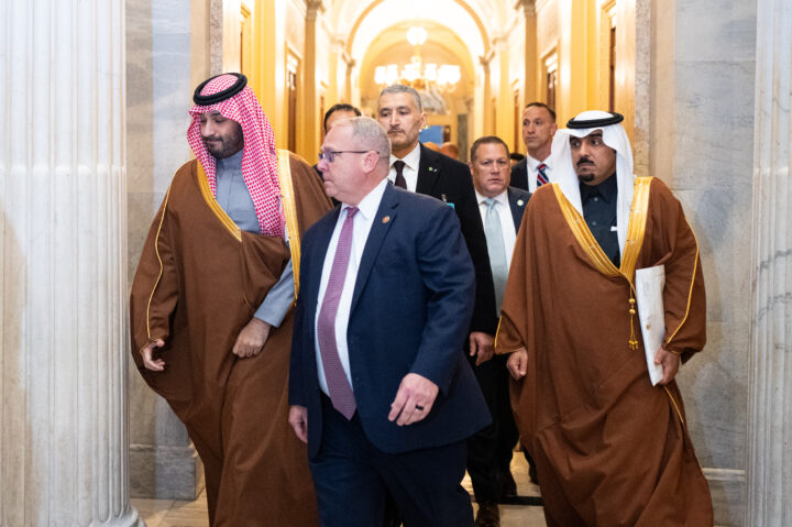 Saudi Crown Prince Mohammed bin Salman, left, escorted by House Sergeant at Arms William McFarland, center, walks to Speaker Johnson's office as he arrives in the U.S. Capitol on Wednesday, November 19, 2025. (Bill Clark/CQ-Roll Call, Inc via Getty Images)