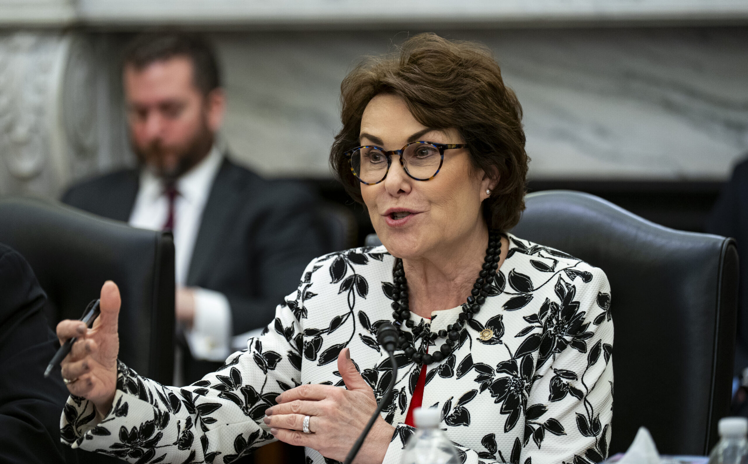 Sen. Jacky Rosen (D-NV), ranking member of the Senate Armed Services Subcomittee on Cybersecurity, speaks during a hearing on Artificial Intelligence cyber capabilities, on Capitol Hill on March 25, 2025 in Washington, DC.